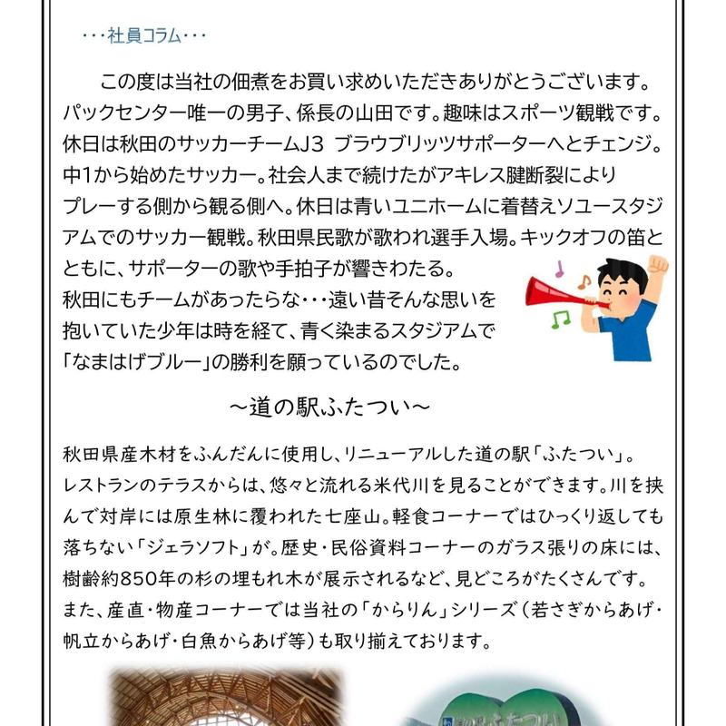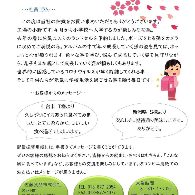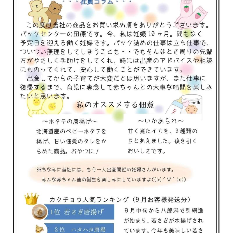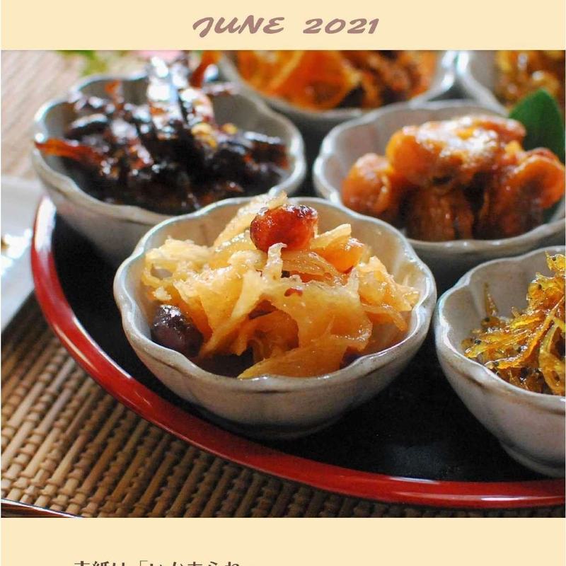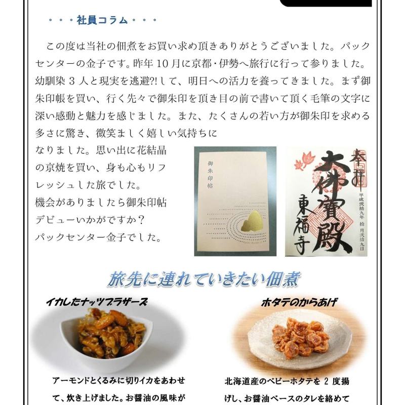 今回は今号の表紙にも掲載されている「いかあられ」の話をします。「いかあられ」はするめいかをローラーで伸ばして(1パイのイカ を 1~2mまで伸ばします!)柔らかくした後、一口サイズに短冊切りにして甘く炊いた商品です。昔からの定番商品で、お茶請けにも人気ですね。