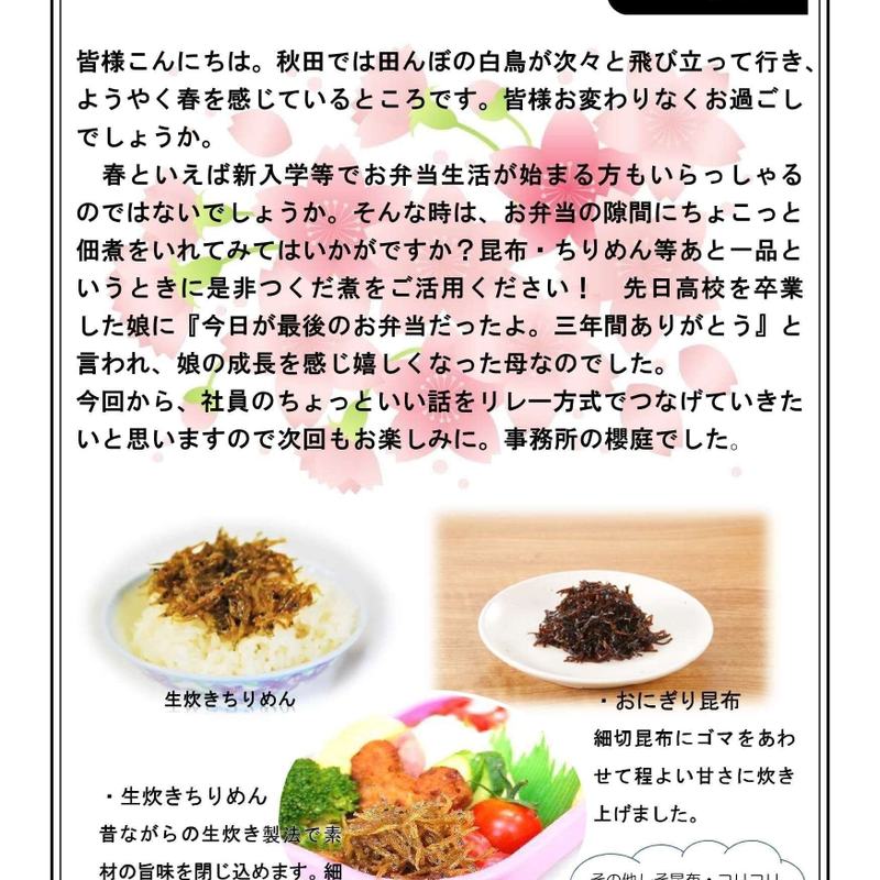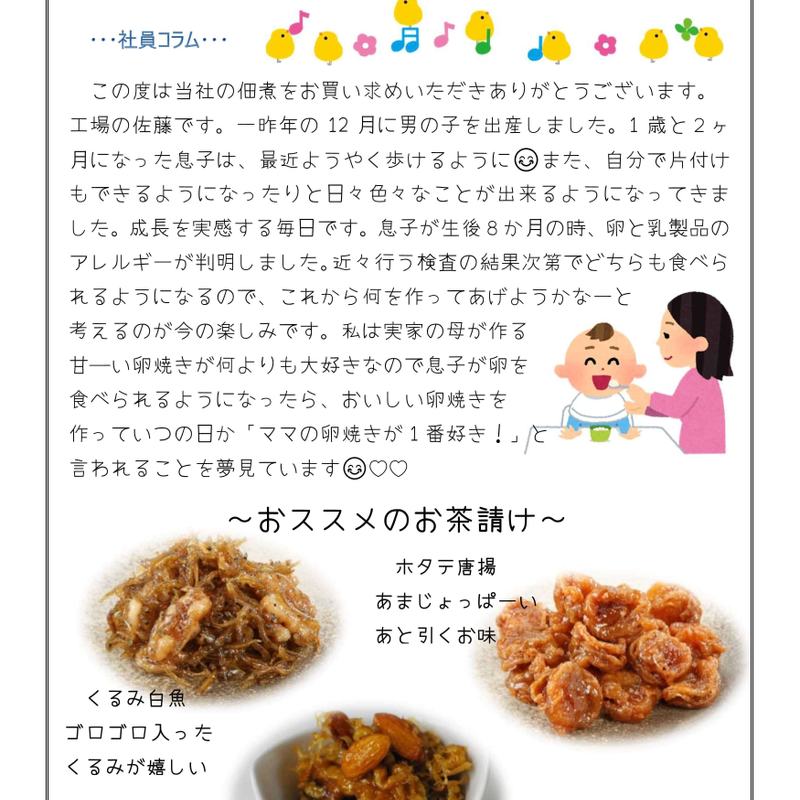 佃煮とは生まれた時からきっ てもきれない関係。子供の頃、一番好きだった佃煮は桜でんぶです。よくお雛様で出る、ピンク色のふわっとしたものです。あれは実は佃煮の一種で、タラなどの身をほぐして細かくすりつぶし、砂糖などを加えて炊いて作られています。子供の頃から甘いのが大好きで、よくご飯に…